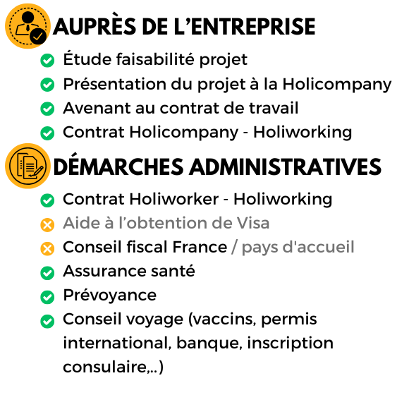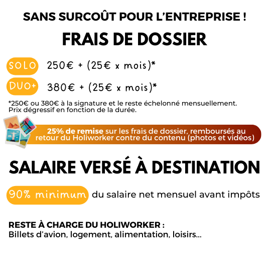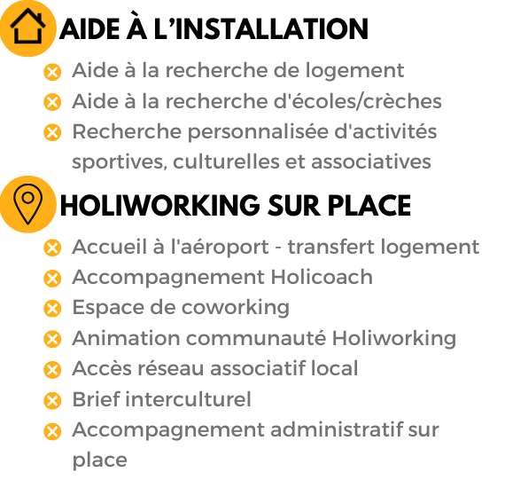 Bien que nous puissions le conseiller et la valider avec lui, c'est le collaborateur qui se charge de trouver la solution d'immigration adaptée à son projet de télétravail de plusieurs mois dans le pays choisi (visa, PVT, double nationalité…), la destination sur mesure, rappelons-le, ne faisant pas partie des destinations Holiworking. Nous n’assurons pas non plus l’espace de coworking, ni l’accompagnement par l'un de nos Holicoachs sur place. Le collaborateur est autonome dans son installation et la mise en place de ses conditions de travail à distance.